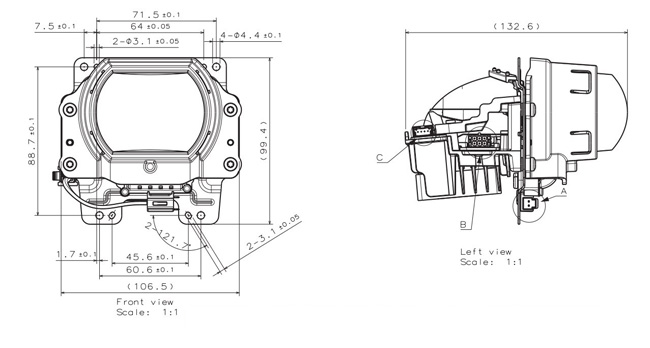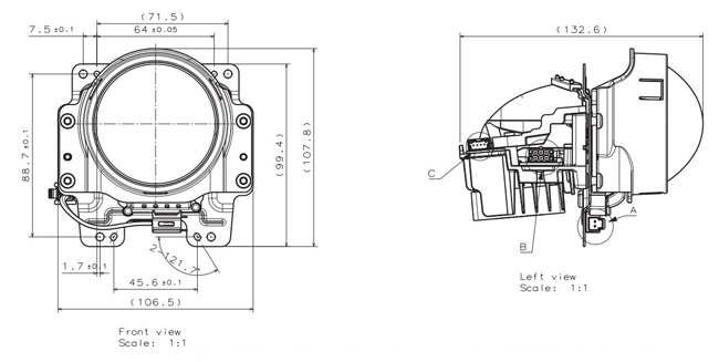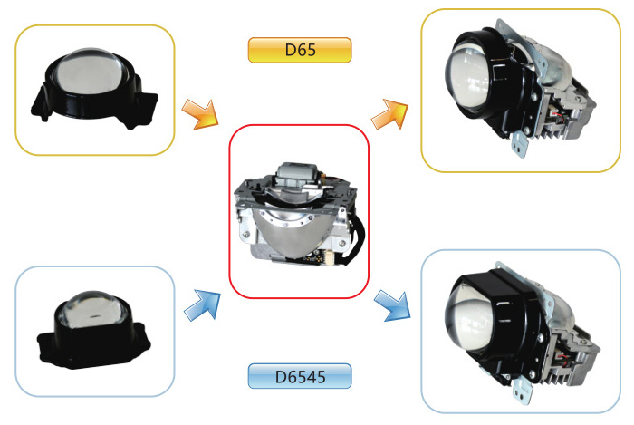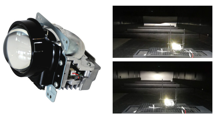 1、功能:远光/近光一体,通过静音马达带动齿轮切换遮光板,实现远近光功能切换。